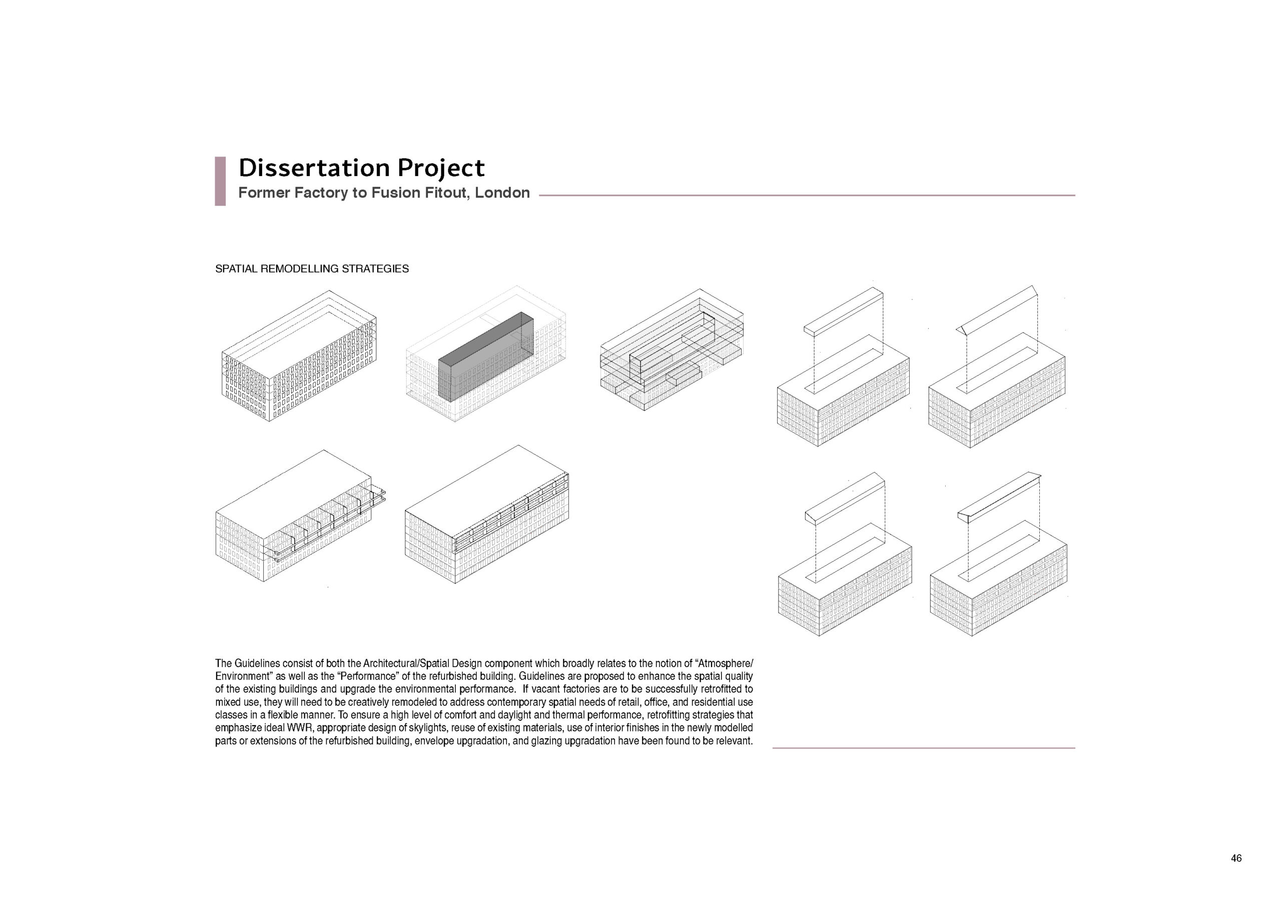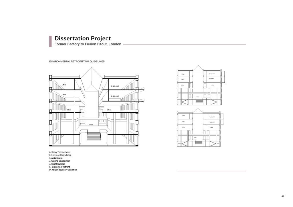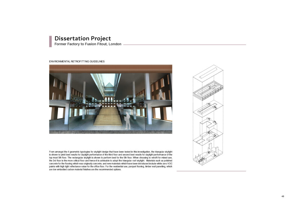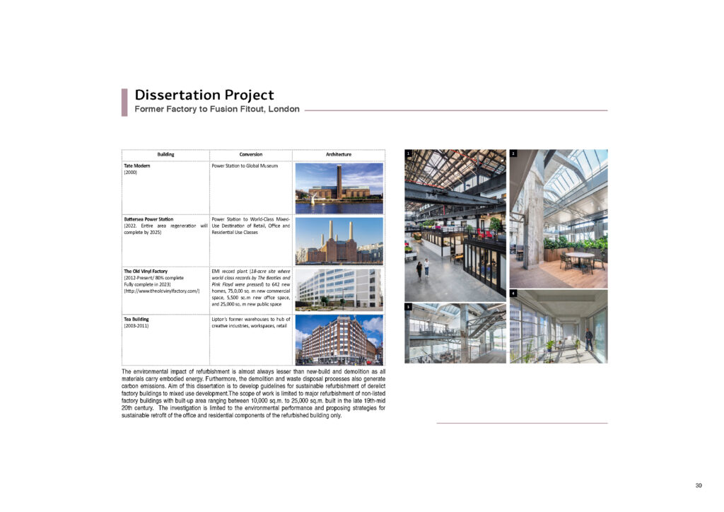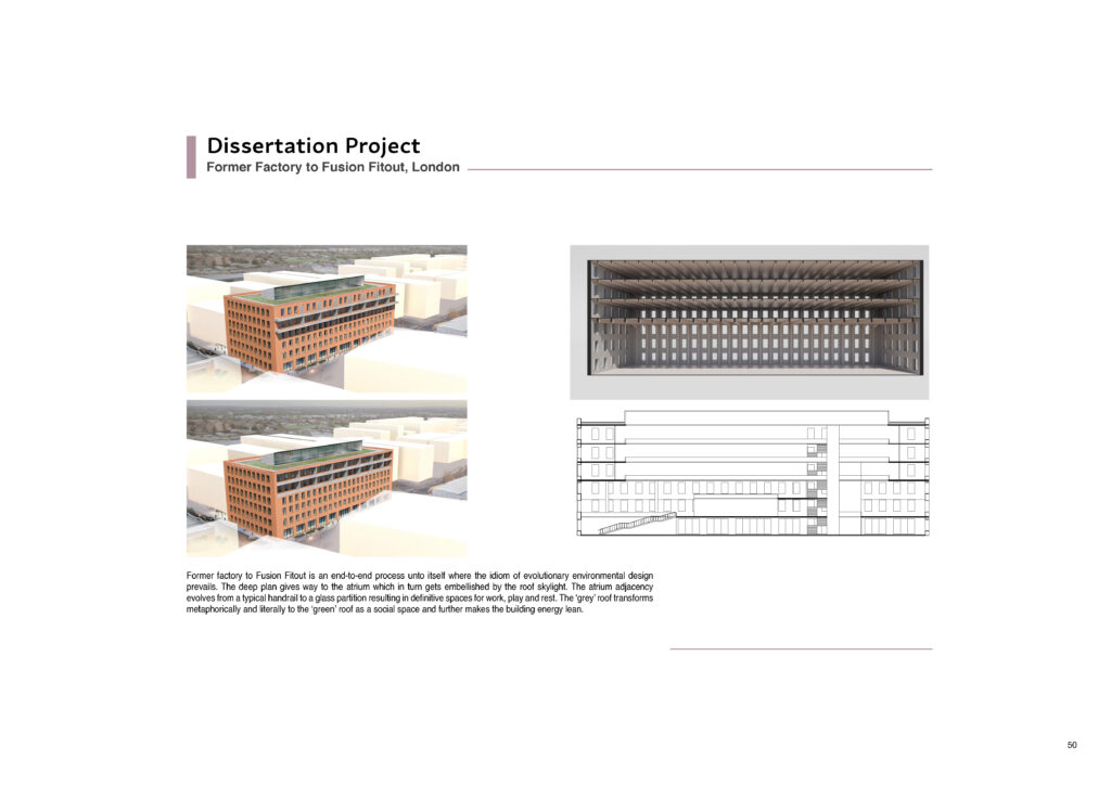 This project was the Dissertation of the Founder – Principal Architect at the M.Sc Sustainable Environmental Design program at the AA London for the year 2021-2022. Cities all over the world are faced with the phenomena of de-industrialization wherein manufacturing industry plants have moved out and what stand in their stead are derelict buildings. Previously located on the outskirts of cities, these structures have come to occupy what is now prime city centre land due to the phenomena of urban sprawl. London is a prime example of such a situation. Once the seat of the Industrial Revolution and home to a diverse set of industries, the London post-industrial landscape is replete with defunct power stations, warehouses, factories, lime kilns, breweries, mills and foundries. Quite a few of them are even Listed buildings due to their historical and cultural significance. This dissertation examines refurbishment of derelict industrial buildings in London into mixed use conversions. The scope of this investigation is limited to non-listed factory buildings with built-up area ranging between 10,000 sq.m. to 25,000 sq.m. The merits of refurbishment of such buildings are known to be manifold. First is preservation of the rich industrial heritage which is an identity marker for the city, second is to reconnect these urban voids into the city morphology and finally refurbishment is a tool to reduce carbon emissions that are generated by new build.