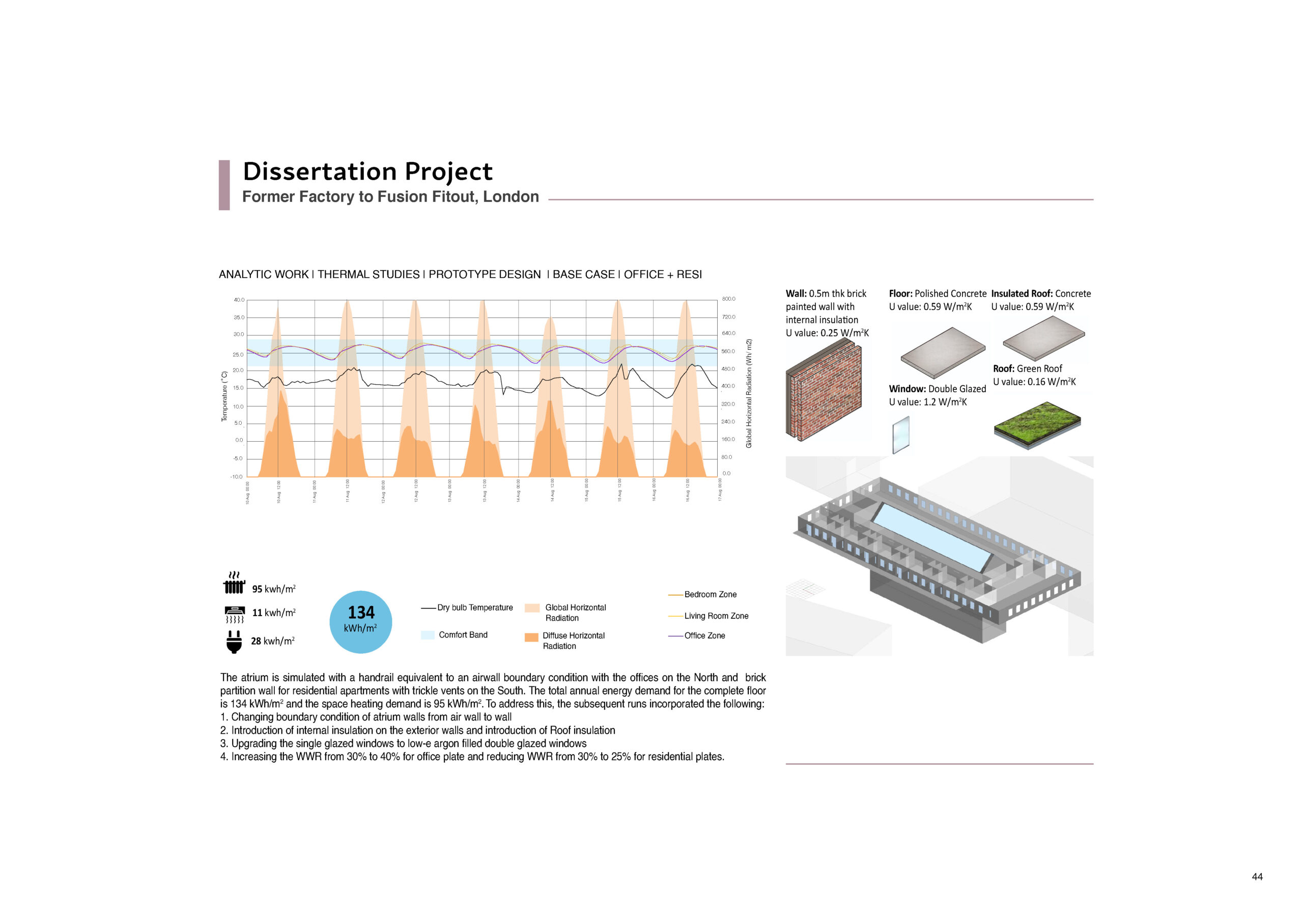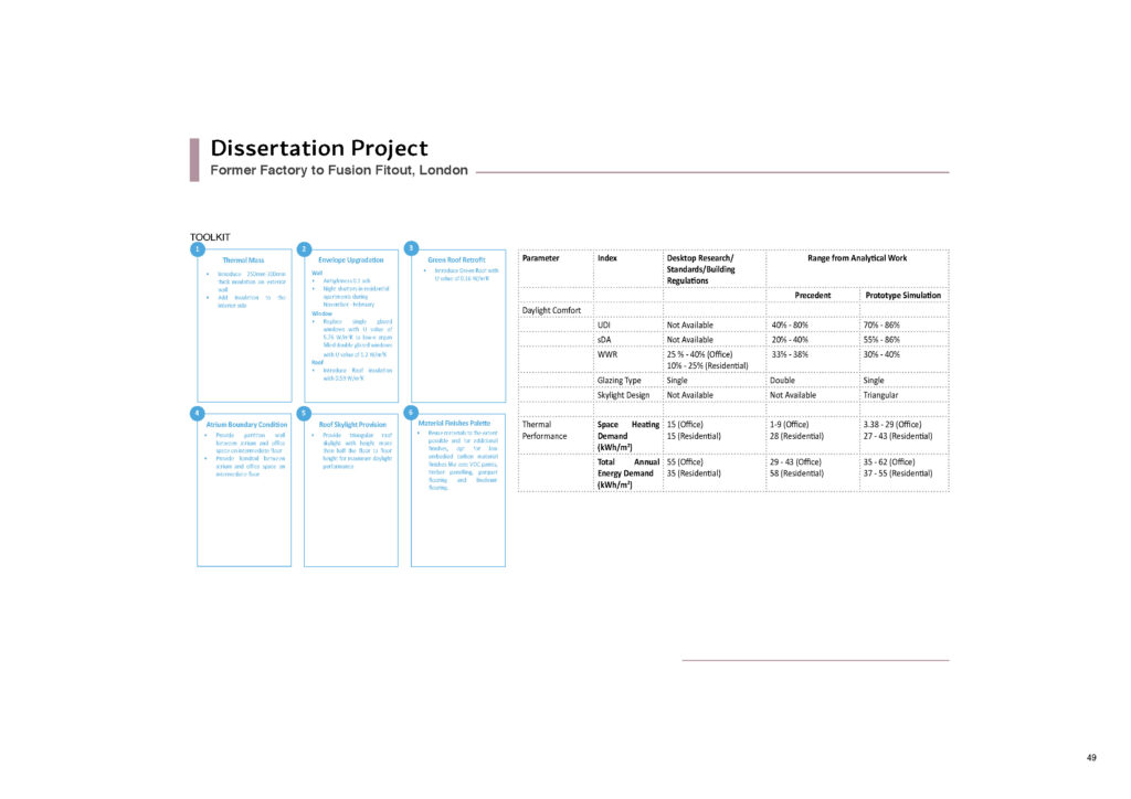 A 30m x 70m deep plan building is the prototype for the investigation into its conversion into the mixed use classes of retail, workplace and residential. The dissertation has derived the theoretical base from desktop research and examples of performative environment from three precedent studies to develop a framework for benchmarking the design possibilities of the prototype. This is followed by fieldwork and analytical work to calibrate the base case and derive a range of performance standards for the protoype which forms the recommendations for the Toolkit for sustainable retrofit of such building typologies.