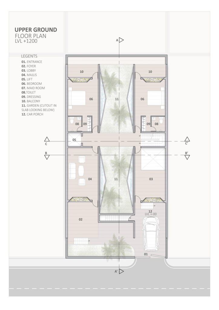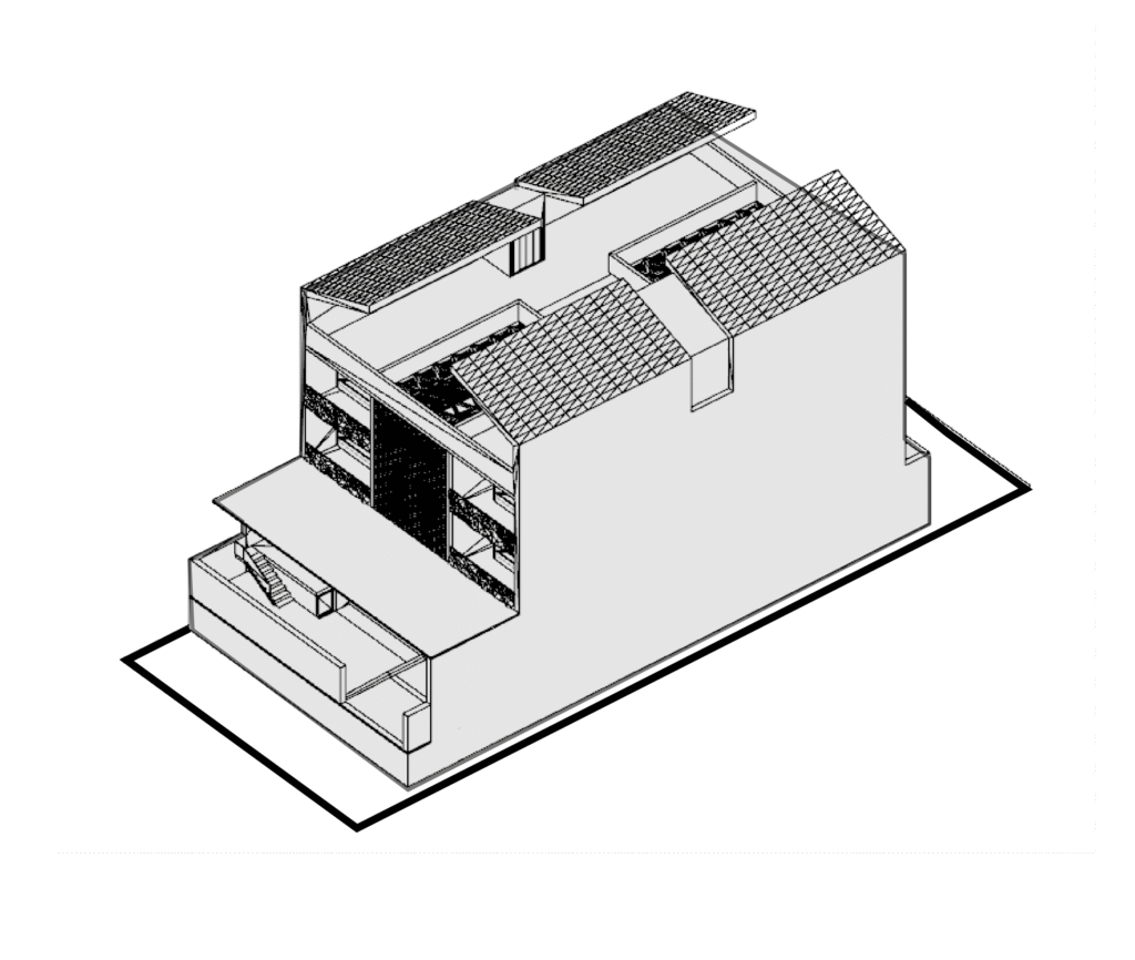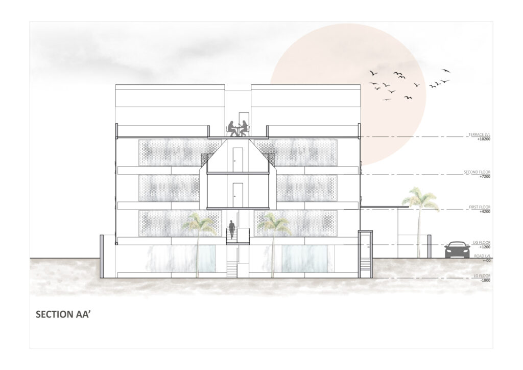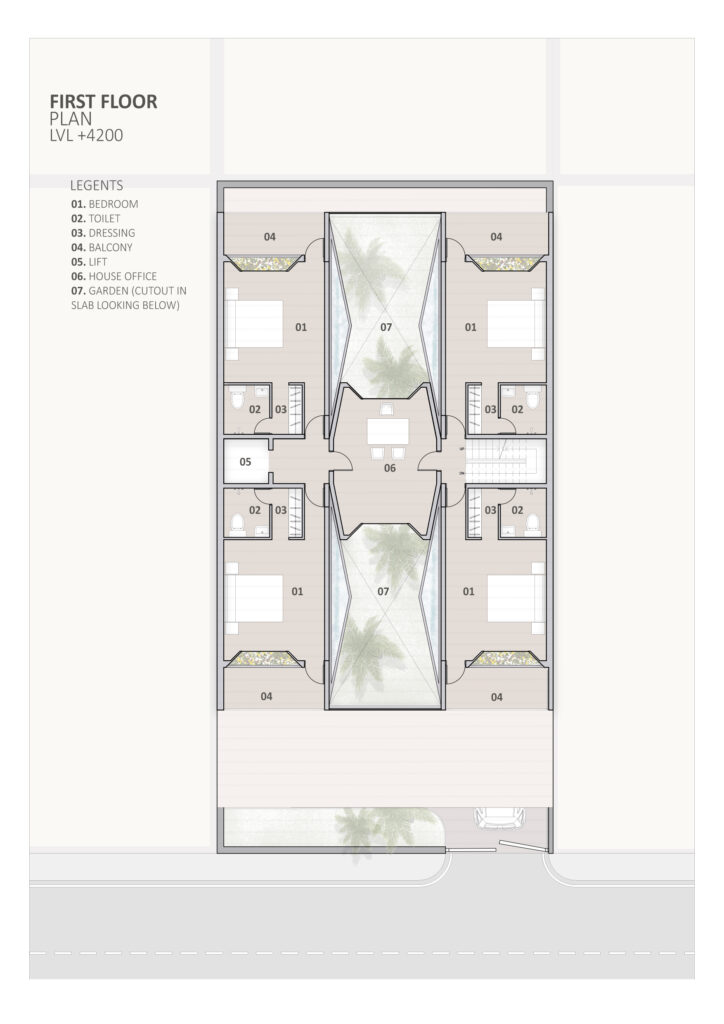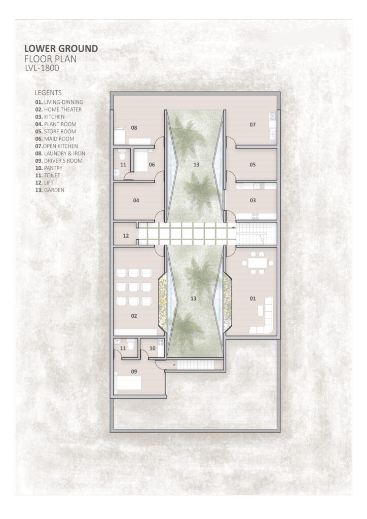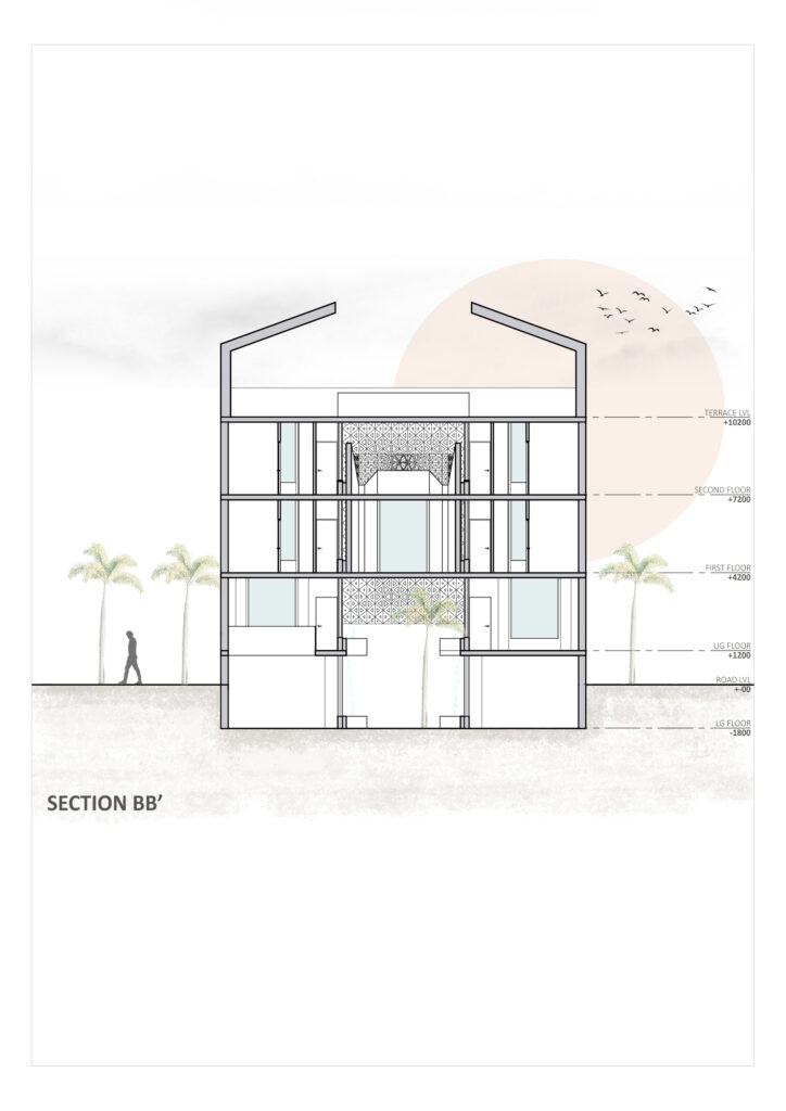 Our journey began with a plot of land, a rectangle set within a landscape of possibilities. Instead of constraining space, we welcomed it, converging the side setbacks into the central courtyard. The intent in disrupting the setback norm is to create an inward looking ‘retreat’, where the family can unwind at all times in the tranquil garden animated with falling water curtains, water bodies and vegetation which act as microclimate modifiers creating a comfortable outdoor environment. The townhouse typology thus created generates opportunities for fostering community ties at the urban morphological level.