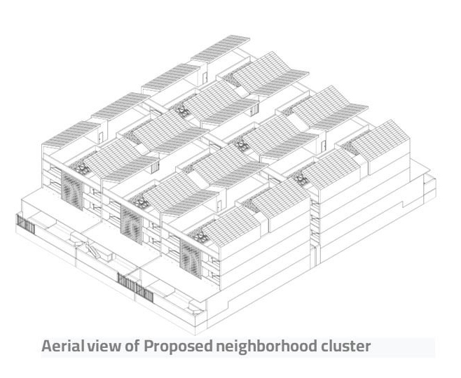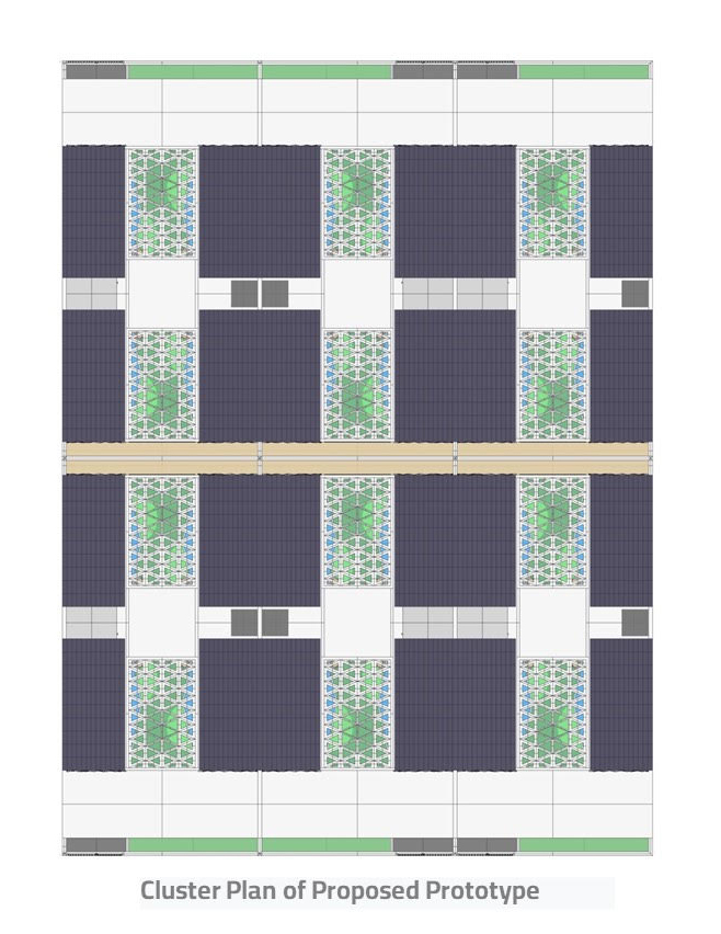 Its spatial organization, symmetric and mirroring, speaks of balance, ease of use and simplicity in construction. The construction technology envisioned for the house is a combination of 2D and 3D prefabricated modular system assembled on site, There are 3 sizes of modules for the service block units, the formal living dining, the Majlis, the home theatre and lobby and the bedrooms respectively. The bedrooms for future expansion can be easily plugged into the core of the house. The Mashrabiya screen on the front and the rear and the space frame above the courtyard are bespoke elements made out of painted bamboo which lend a crafted character to the house.